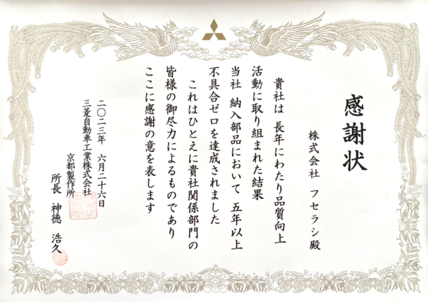 2023.06.26 アワード 三菱自動車工業株式会社 京都製作所様より『品質優秀賞』受賞 三菱自動車工業株式会社 京都製作所様より、『品質優秀賞』を受賞致しました。 今後もお客様のご期待に沿えるように努めて参ります。 アワード一覧へ ニュース一覧へ