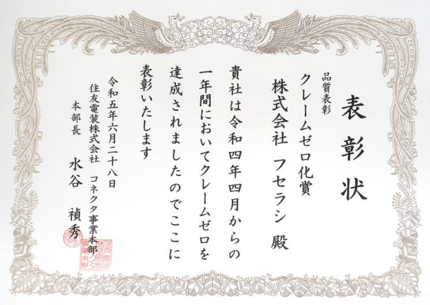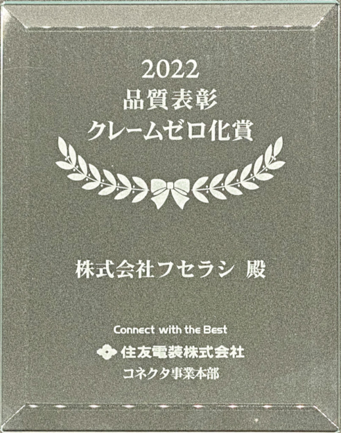 2023.06.28 アワード 住友電装株式会社様より『クレームゼロ化賞』受賞 住友電装株式会社様より、『クレームゼロ化賞』を受賞致しました。 今後もお客様のご期待に沿えるように努めて参ります。 アワード一覧へ ニュース一覧へ