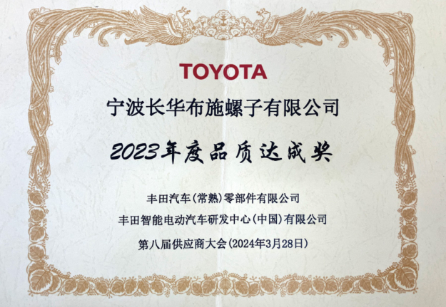 2024.03.28 アワード 寧波長華布施螺子有限公司 丰田汽车(常熟)零部件有限公司様より『品質達成賞』受賞 寧波長華布施螺子有限公司が丰田汽车(常熟)零部件有限公司様より『品質達成賞』を受賞致しました。 今後もお客様のご期待に沿えるように努めて参ります。 アワード一覧へ ニュース一覧へ