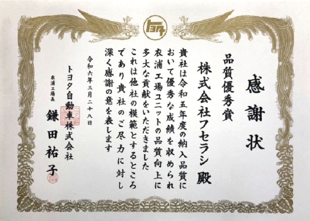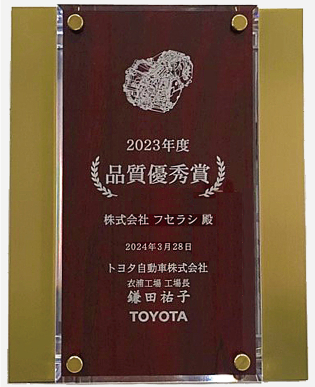 2024.03.28 アワード トヨタ自動車株式会社 衣浦工場様より『品質優秀賞』受賞 トヨタ自動車株式会社 衣浦工場様より、『品質優秀賞』を受賞致しました。 今後もお客様のご期待に沿えるように努めて参ります。 アワード一覧へ ニュース一覧へ