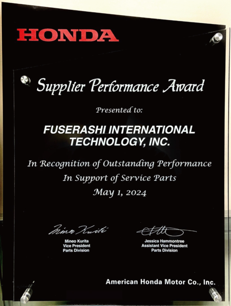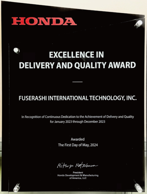 Fuserashi International Technology Inc.が北米HONDA様より『Supplier Performance Award賞』『Excellence In Delivery And Quality Award賞』のダブル受賞を致しました。