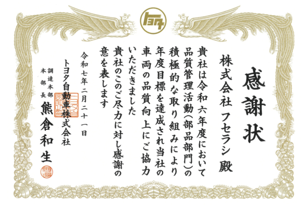 2025.02.21 アワード トヨタ自動車株式会社様より『品質管理活動(部品部門) 感謝状』受賞 トヨタ自動車株式会社様より、『品質管理活動(部品部門) 感謝状』を受賞致しました。 今後もお客様のご期待に沿えるように努めて参ります。 アワード一覧へ ニュース一覧へ