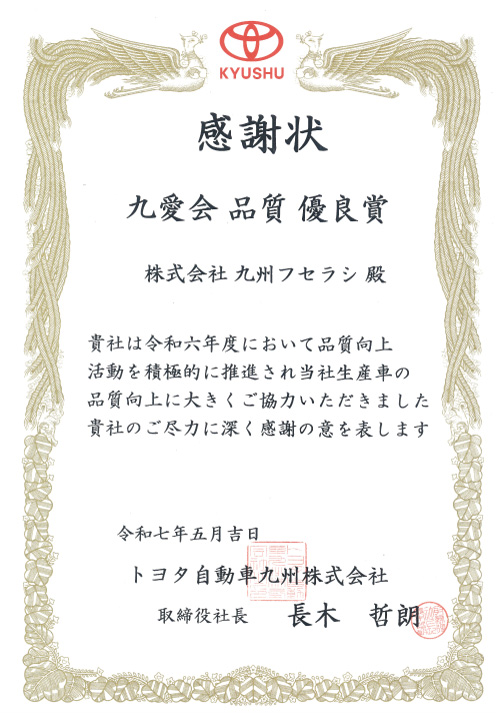 2025.05.30 アワード 株式会社九州フセラシ トヨタ自動車九州株式会社様より『品質優良賞』受賞 株式会社九州フセラシがトヨタ自動車九州株式会社様より『品質優良賞』を受賞致しました。 今後もお客様のご期待に沿えるように努めて参ります。 アワード一覧へ ニュース一覧へ