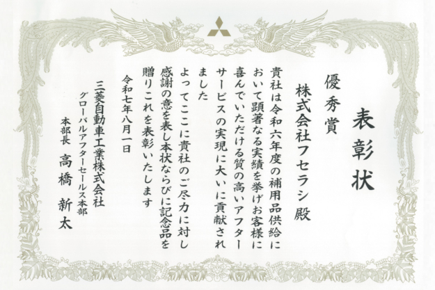 2025.08.01 アワード 三菱自動車工業株式会社様より『サプライヤー 優秀賞』受賞 三菱自動車工業株式会社様より『サプライヤー 優秀賞』を受賞致しました。 今後もお客様のご期待に沿えるように努めて参ります。 アワード一覧へ ニュース一覧へ